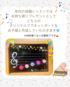 12月31日までの体験レッスンでは、 ⭐️お家でも楽しく学べる⭐️poco a pocoオリジナル「五線マグネットボード」 を、お作りいただけます🎵この機会に是非体験レッスンにお越しください(^^) (体験レッスンは¥1000かかりますが、一週間以内にご入会いただきますと入会金¥3000から¥1000引き致します)